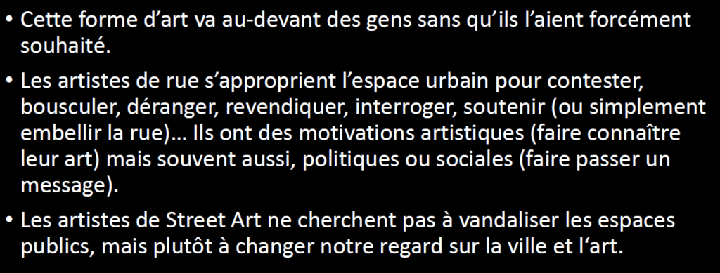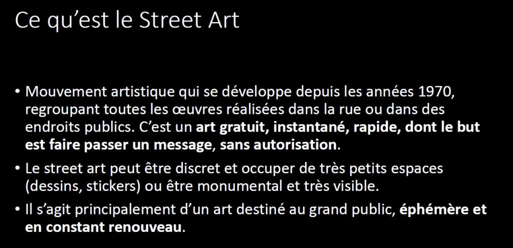 La présentation démarre par une définition du street art (ce qu’il est et ce qu’il n’est pas), puis se poursuit par un historique (origines et histoire récente), mais elle est essentiellement axée sur les implications urbaines du street art, autour de deux thèmes, illustrés par des exemples en France et à l’étranger :