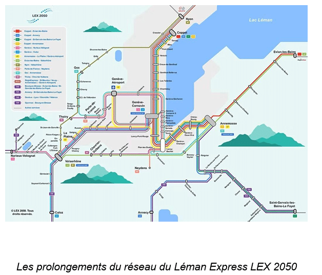 Les projets de prolongements du réseau du Léman Express (LEX) doivent permettre de constituer un système de bouclage efficace de la desserte des territoires de l’Espace lémanique, en résolvant les différentes lacunes de desserte, notamment celles citées ci-dessus. Nous pouvons dire qu’ « il y a loin de l’incantation à l’action » et le passage de l’évocation du développement durable à des mesures d’application concrète va nécessiter discernement et courage politique, mais il faut en passer par là si l’on veut sortir des discours non fondés sur des réalisations concrètes !