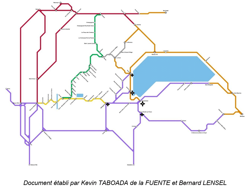 Dans le même esprit, nos travaux sur le réseau actuel du LEX aboutissent à définir 5 étoiles ferroviaires structurantes à l’échelle du Grand Genève, réparties entre Suisse et France, soit, par ordre alphabétique Annemasse, Bellegarde/Valserhône, Genève/Cornavin, La Roche sur Foron et Nyon.